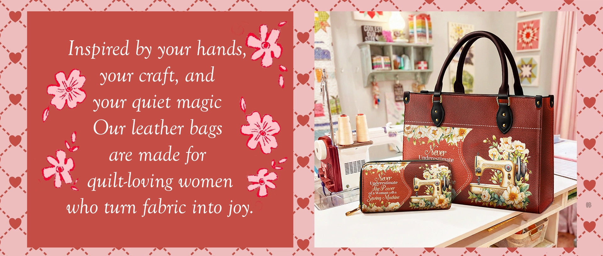 Exclusive leather bags with quilting and sewing-inspired designs.