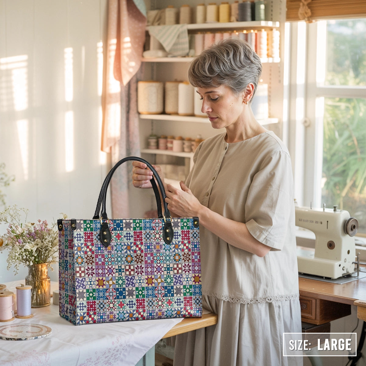 More than an accessory, it’s a wearable memory — a tribute to beloved quilt patterns, slow stitching, and the legacy of handmade traditions. Whether carried on daily errands, quilting guild meetups, or peaceful afternoons, it adds grace, meaning, and character and a touch of soul to every step.
