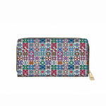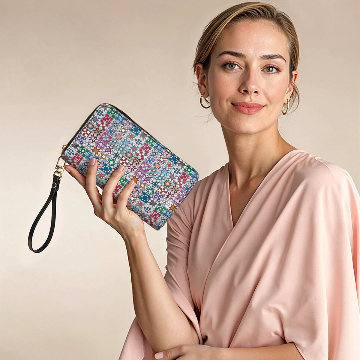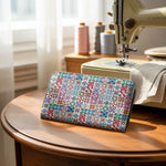 This elegant leather wallet features classic quilt blocks delicately illustrated across a symmetrical patchwork-inspired layout. With its cool-toned palette of blues, purples, and earthy reds and refined, timeless detailing, it reflects quiet joy, tradition, and the peaceful rhythm of handwork.
