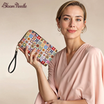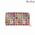 This delightful leather wallet features a bright patchwork of traditional quilt blocks delicately illustrated across a continuous, seamless quilt-inspired layout. With its playful color mix, soft stitched accents, and charming crafted finish, it reflects the joy of quilting and the beauty found in handmade details.