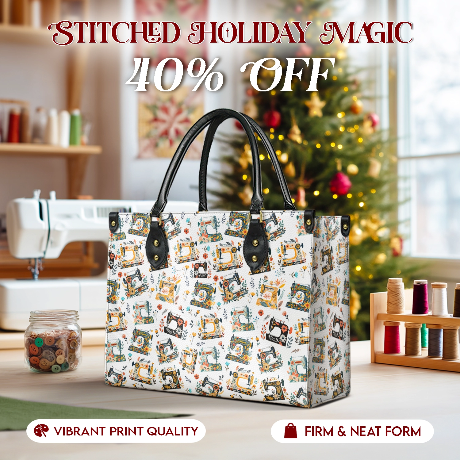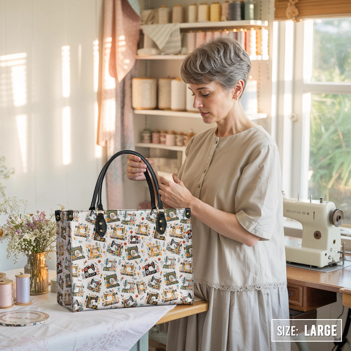 This playful and vibrant leather bag features a charming array of colorful vintage sewing machines gracefully illustrated within a scattered floral and leaf-patterned background. With its cheerful mix of orange, teal, mustard, and black tones paired with whimsical botanical accents, it tells a story of joyful creativity, everyday inspiration, and a love for handmade artistry.