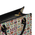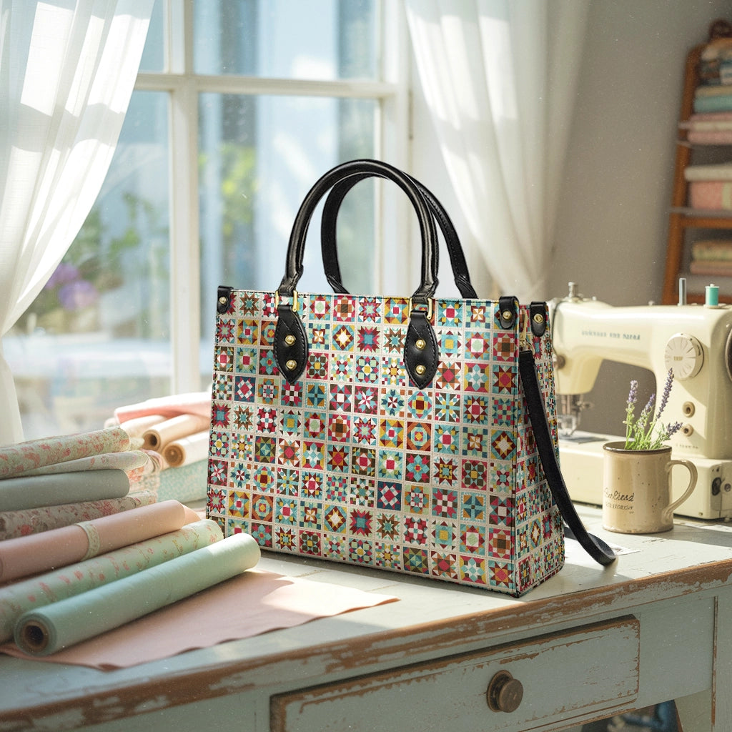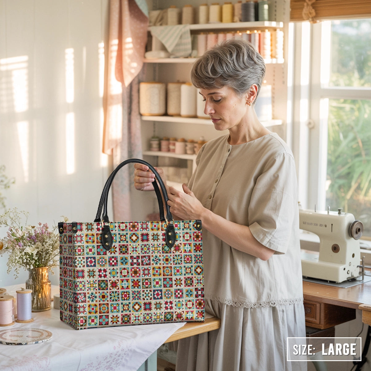 This vibrant leather bag features a classic sampler of quilt blocks gracefully illustrated within a color-rich patchwork layout. With its earthy reds, mustard yellows, and soft aquas and timeless handcrafted details, it tells a story of joyful making, heritage, and everyday creativity.