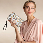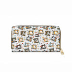 This lively leather wallet features a playful collection of colorful vintage sewing machines delicately illustrated across a scattered floral-patterned layout. With its bright oranges, teal greens, and pops of yellow against a soft background, it reflects joyful energy and creative passion.