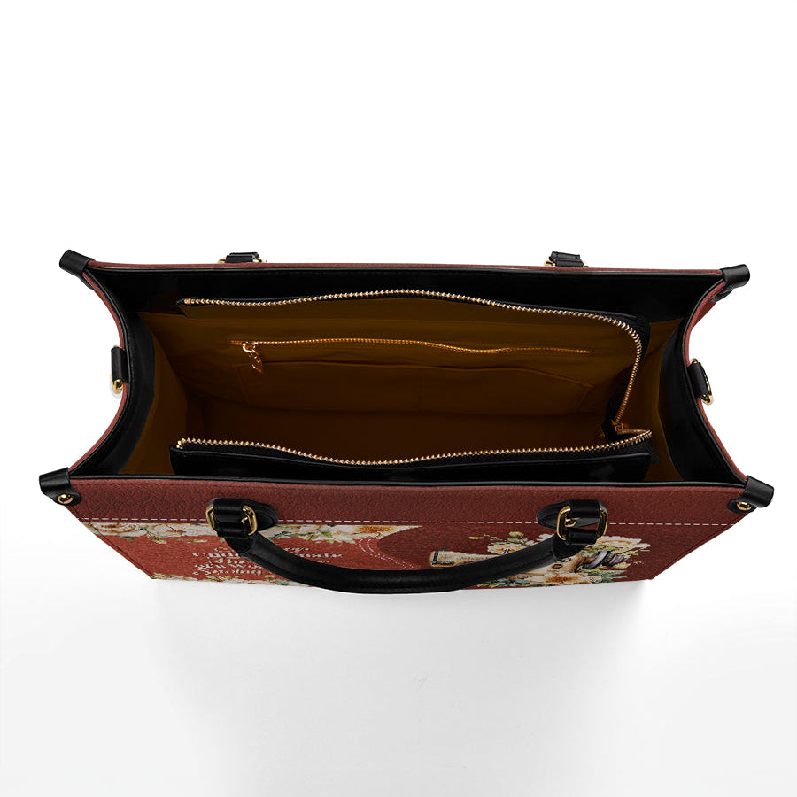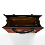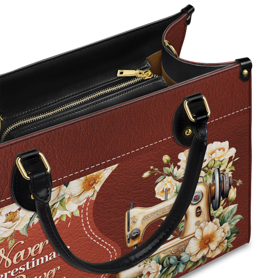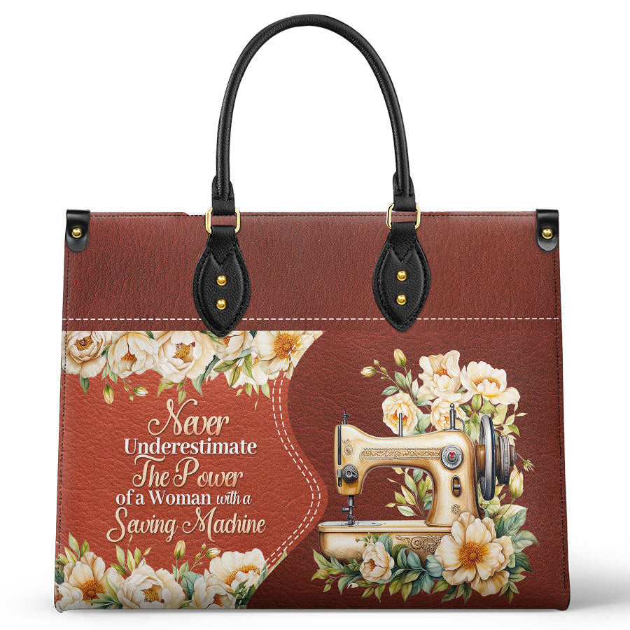 This bold and empowering leather bag features a vintage sewing machine gracefully illustrated within a lush floral arrangement. With its warm chestnut tones, creamy blooms, and hand-stitched inspired borders, it tells a story of strength, creativity, and timeless feminine pride.